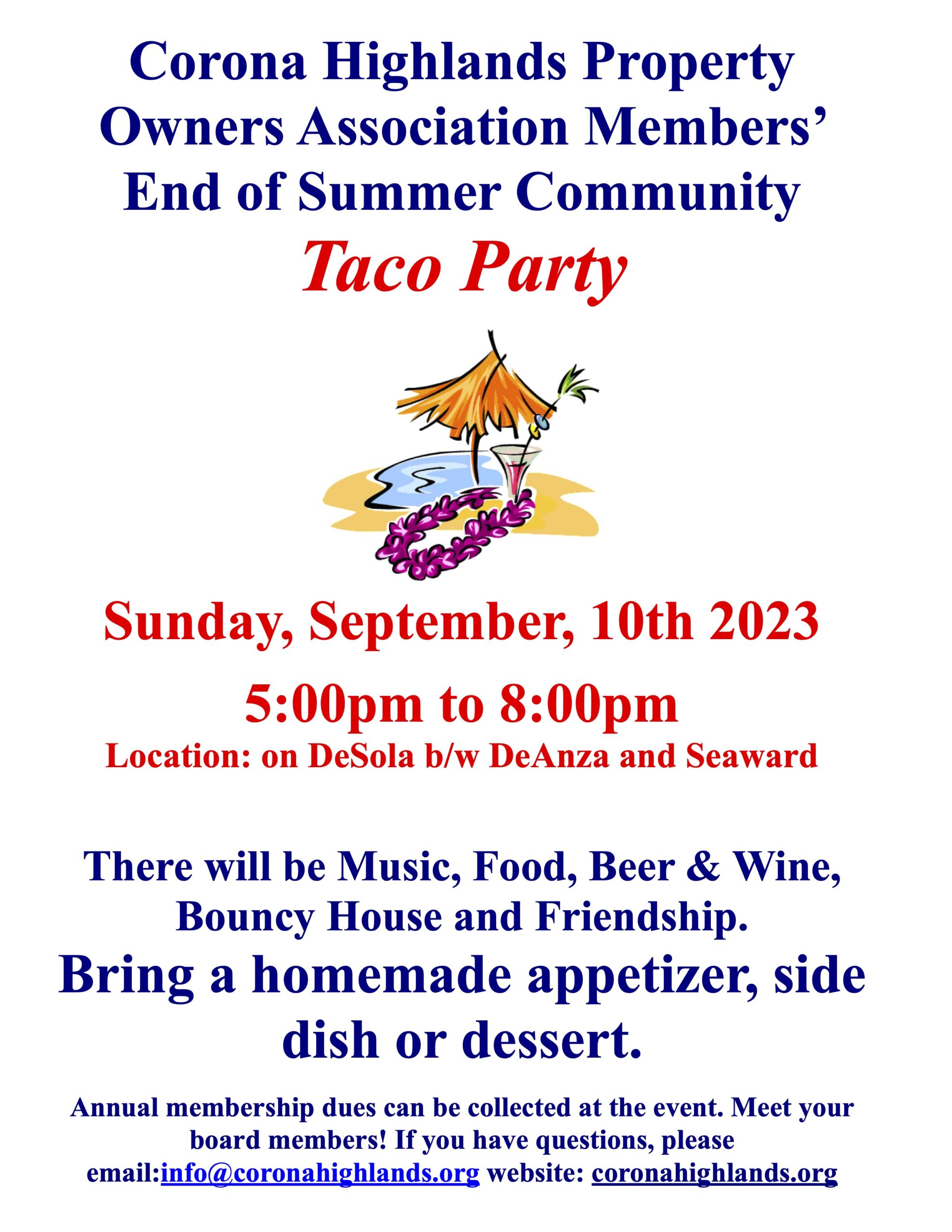You are invited to our annual Taco Party Event on Sunday, September 10th from 5:00pm to 8:00 pm. There will be Music, Food, Beer & Wine, Bouncy House, and Friendship.