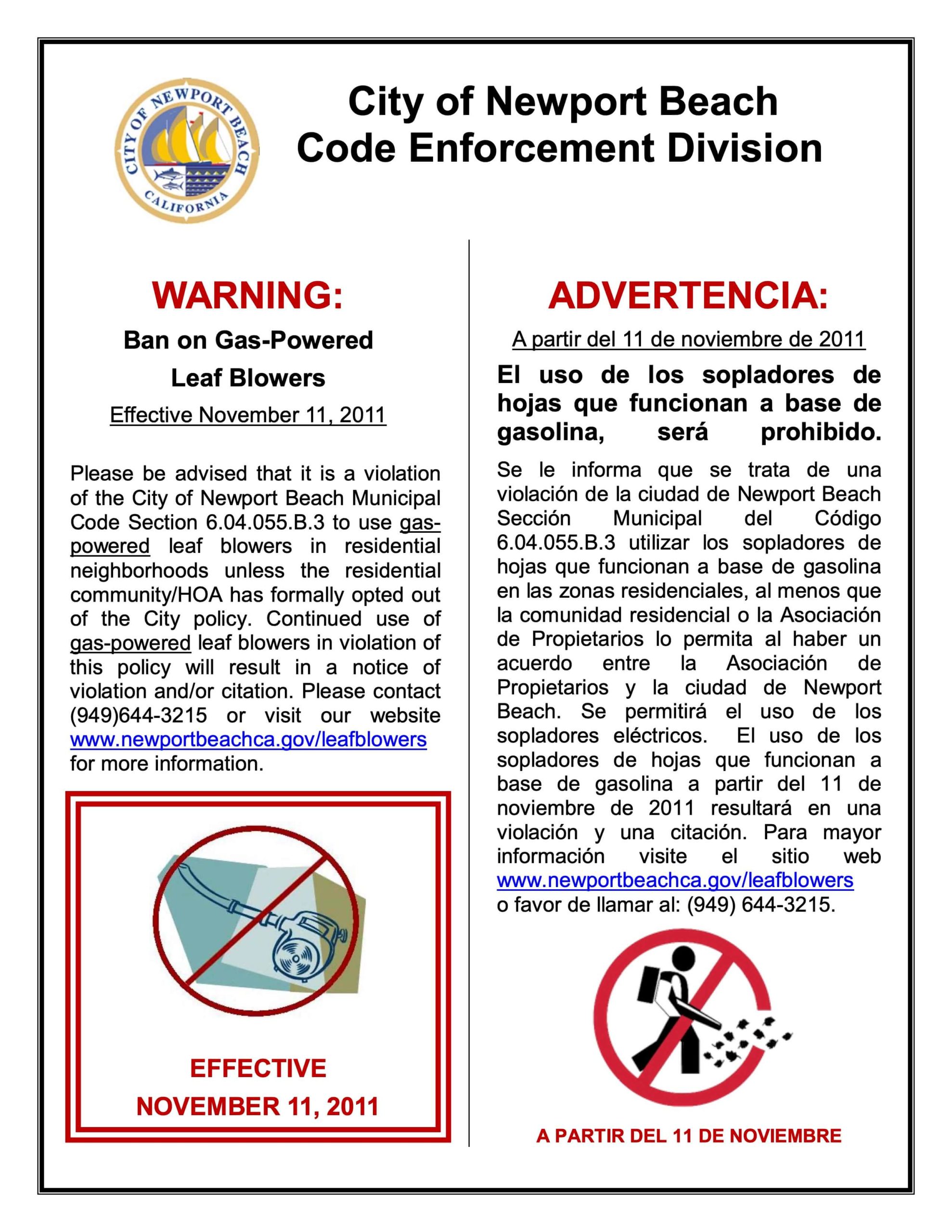 We wanted to give you a friendly reminder that the city of Newport Beach has banned the use of gas-powered leaf blowers. Please see the flyer from the City of Newport Beach Code Enforcement Division, which is posted below for your ease of reference.